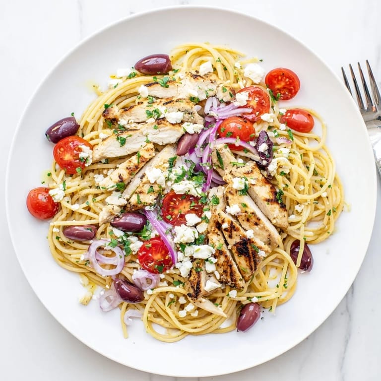 Pin to board The first time I made this Greek chicken spaghetti, I'd just come home from a long trip and was craving something bright and garlicky. My apartment was empty, but the moment those cherry tomatoes hit the hot pan and started to blister, the whole kitchen suddenly felt full again. It's funny how a simple combination of olives, feta, and lemon can transport you straight to a sun-drenched taverna, even on a Tuesday night.