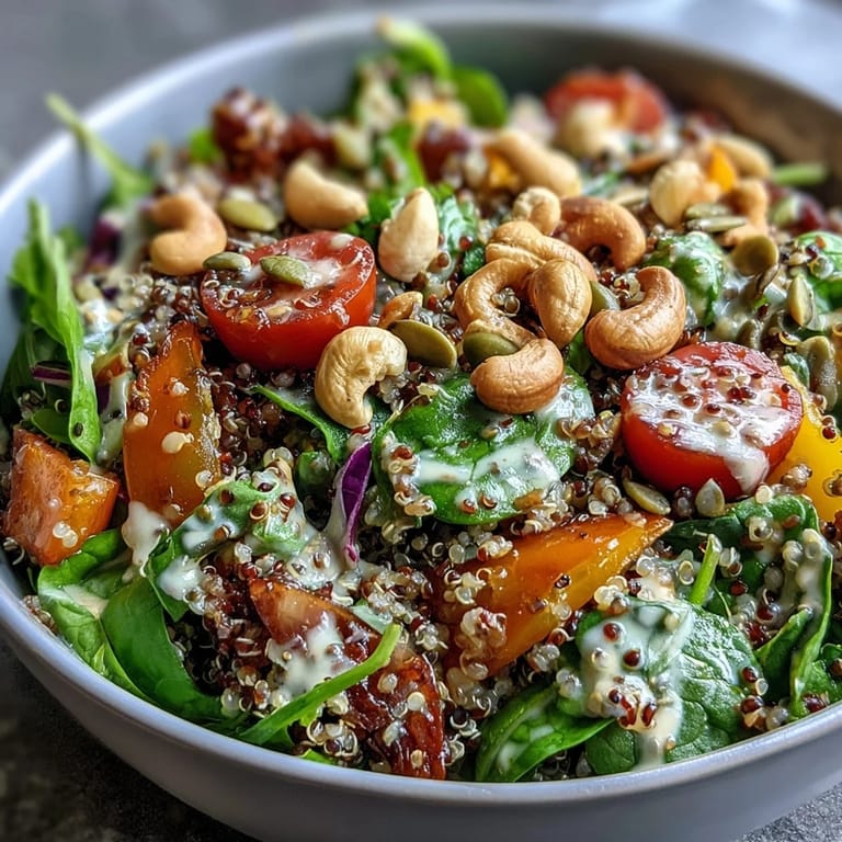 Pin to board The Rainbow Salad Bowl is a vibrant, nutrient-packed dish featuring a colorful array of fresh vegetables, wholesome grains, protein-rich beans, crunchy nuts, and seeds, all tossed with a zesty light dressing. This versatile meal is perfect for a nutritious lunch or dinner that satisfies both the eyes and the body with its variety of colors and textures.